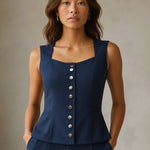 Women Blue Rhombus Neck Sleeveless Front Button Top