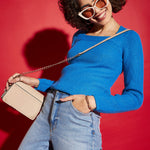 Women Blue Rib Square Neck Full Sleeves Sweater