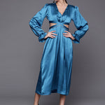 Blue Satin Cut Out Midi Dress, in Satin fabric, Unlined, Midi Length, Regular Fit, Zipper Closure, Straight Hemline and features Diamante Chain Detail At Neck And Waist