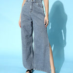 Blue Side Slit Straight Jeans