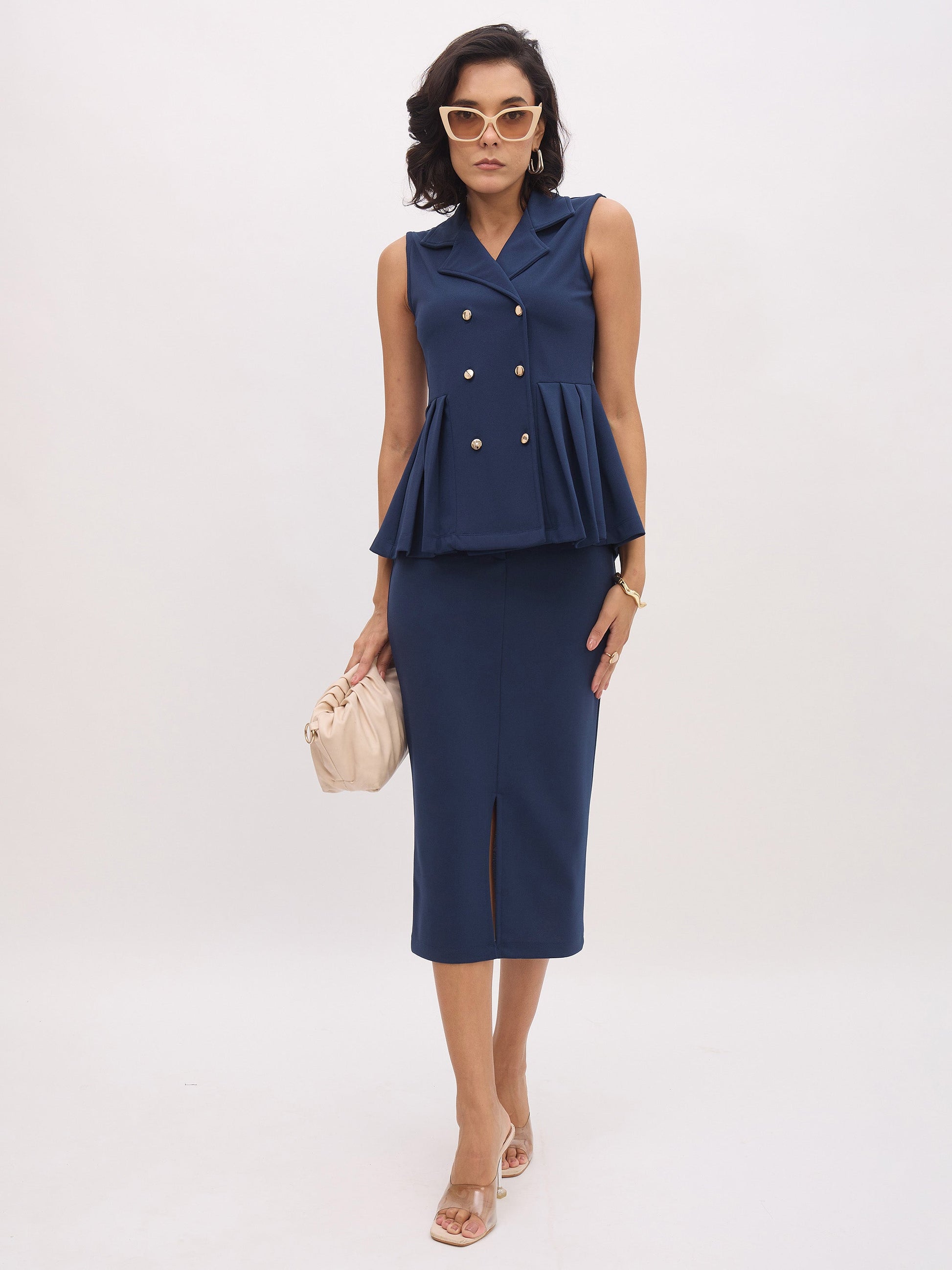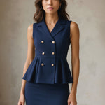 Blue Sleeveless Notch Collar Button Top, in Canton fabric, Unlined, Regular Length, Regular Fit , Button Closure, Straight Hemline and features Button Detail