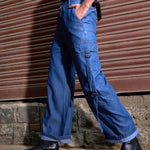 Blue Tencel Cargo Pants, in Tencel fabric, Unlined, Full Length, Comfort Fit, Button Closure, Straight Hemline and features Pocket Detail at Knee