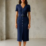 Women Blue V Neck Button Belt Midi dress