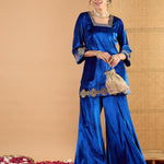 Women Blue Velvet Embroidered Glass Neck Short Kurta With Palazzos
