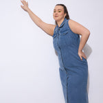 Women Blue Wash Denim Front Button Midi Dress