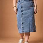 Women Blue Wash Denim Side Button Midi Skirt