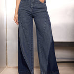 Blue Washed ColorBlock Wide Leg Jeans, in Denim fabric, Unlined, Full length, Straight Fit, Zipper Closure, Straight Hemline and features Color Block At Side Seam