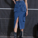 Blue Washed Denim Box Pocket Midi Skirt, in Denim fabric, Casual , Below Knee, Button Closure, Unlined , Slit At Front Hemline and features 4 Pockets
