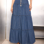 Blue Washed Denim Tiered Maxi Skirt, in Denim fabric, Unlined, Maxi Length, Comfort Fit, Slip On, Flared Hemline and features Button Detail At Front