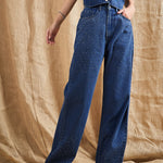 Blue Washed Front Studded Straight Fit Jeans, in Denim fabric, Unlined, Full Length, Straight Fit, Button Closure, Straight Hemline and features Stud Work At Waist & Hem