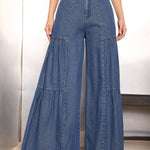 Blue Washed Gathered Front Flared Jeans, in Denim fabric, Unlined, Full length, Comfort Fit, Slip On, Straight Hemline and features Gathers At Front