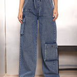 Blue Washed High Rise Drawstring Jeans, in Denim fabric, Unlined, Full length, Comfort Fit, Slip On, Straight Hemline and features Drawstring At Waist