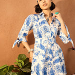 Blue & White Floral Front Button Belted Short Dress, in Cotton Poplin fabric, NA, Above Knee, Fit & Flare, Button Closure, Flared Hemline and features Self Belt Detail