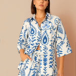 Blue & White Floral Oversized Shirt With Shorts, in Cotton Cambric fabric, Cotton Voile Lining, Regular Length , Comfort Fit , Button Closure, Straight Hemline and features Self Fabric Button At Front