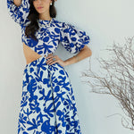 Blue & White Floral Side Cut Out Midi Dress, in Cotton Poplin fabric, Cotton Voile, Midi Length, Fit & Flare, Button Closure, Flared Hemline and features Cut Out Detail At Waist