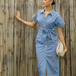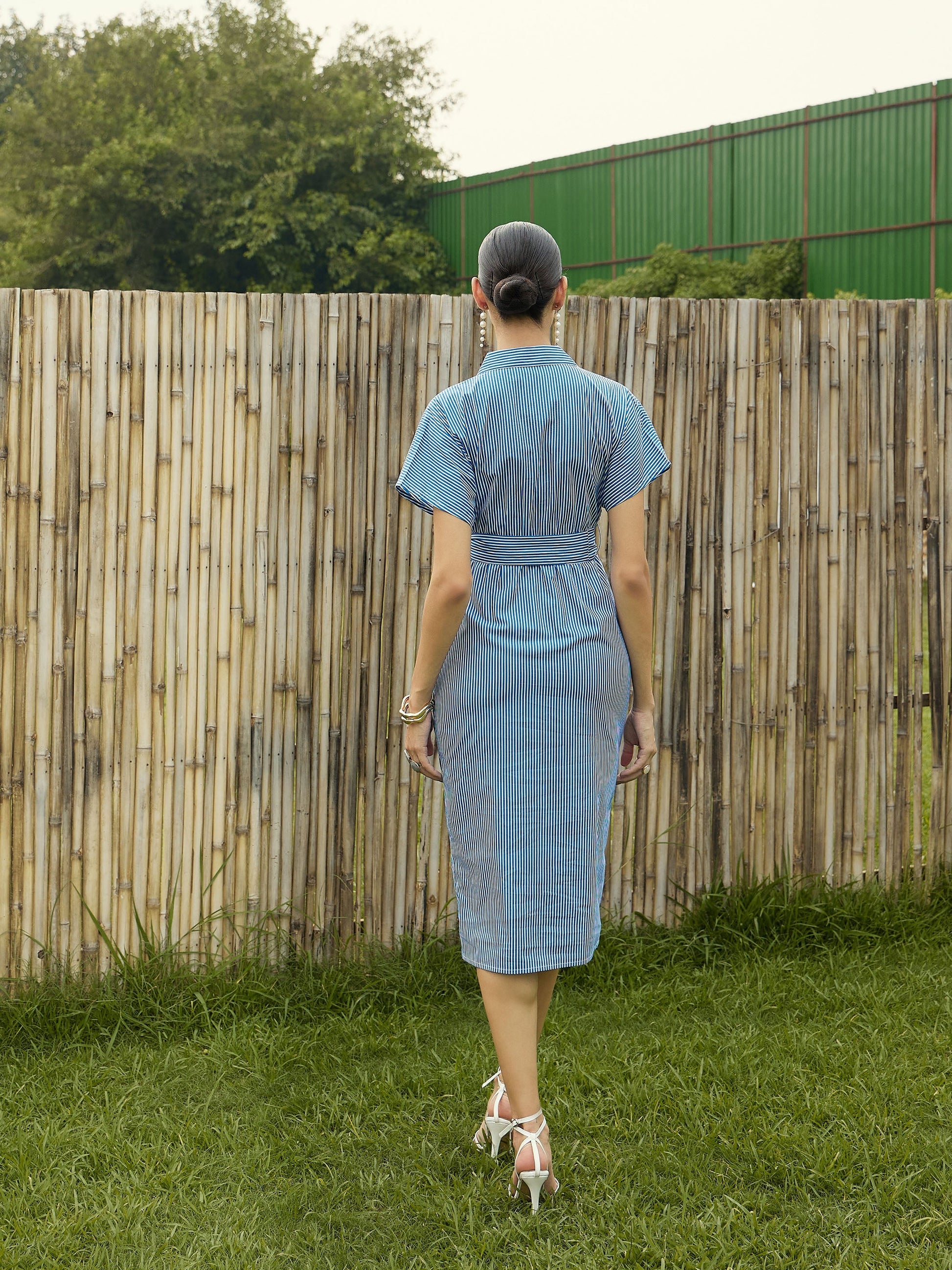 Blue & White Stripe Front Ruched Midi Dress, in Cotton Poplin fabric, Cotton, Midi Length, Comfort Fit, Button Closure, Straight Hemline and features Belt Detail At Waist