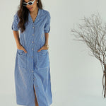 Blue & White Stripe Notch Collar Midi Dress, in Cotton Poplin fabric, Cotton, Midi Length, Comfort Fit, Button Closure, Straight Hemline and features Pocket Detail At Front