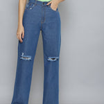 Women Blue Wide Leg Distressed Slit Jeans