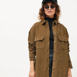 Brown Corduroy Oversized Shirt, in Corduroy fabric, Unlined, Regular Length, Oversize Fit, Button Closure, Curved Hemline and features Flap Pockets At Front