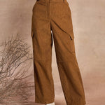 Brown Corduroy Straight Fit Cargo Pants, in Corduroy fabric, Unlined, Full Length, Comfort Fit, Button Closure, Straight Hemline and features Flap Pocket Detail At Side