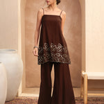 Women Brown Embroidered Strappy Kurta With Palazzos