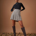 Brown Flannel Check Pleated Mini Skirt, in Yarn Dyed Check fabric, Unlined, Above Knee, Fit & Flare, Button Closure, Flared Hemline and features Knife Pleating Detail