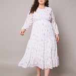 Brown Floral Tiered Maxi Dress, in Georgette fabric, Poly Knit Lining, Maxi Length, Fit & Flare, Button Closure, Flared Hemline and features Key Hole Detail At Back Side