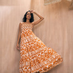Brown Ikat Print Smocked Bust Tiered Maxi, in Cotton Cambric fabric, Cotton Voile, Maxi Length, Fit & Flare, No Closure, Flared Hemline and features Smocking Detail At Waist