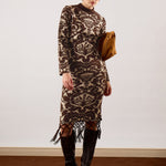 Women Brown Jacquard Acrylic Wool High Neck Hem Frindge Midi Dress