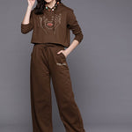 Women Brown Line Art Crop Hoodie With Track Pants