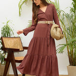 Women Brown Polka Dot Belted Tiered Maxi Dress