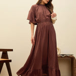Women Brown Polka Dot Flared Hem Maxi Dress