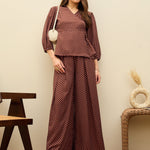 Women Brown Polka Dot Wrap Top With Flared Pants