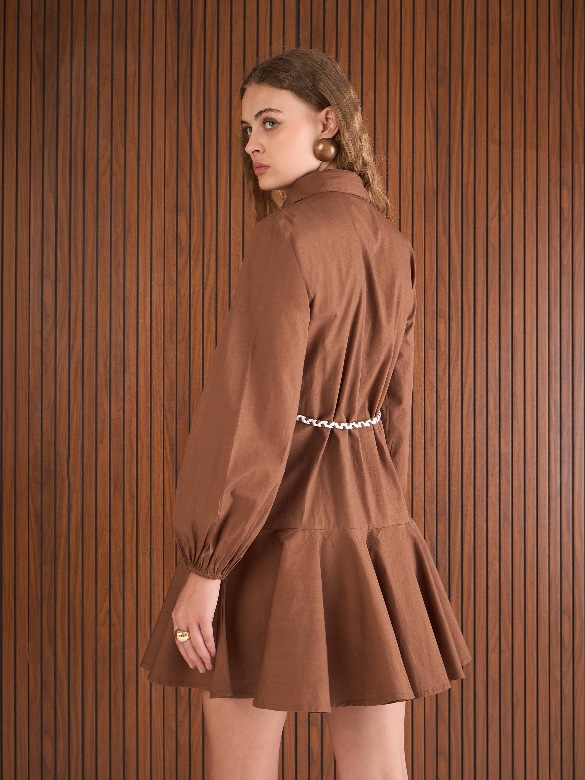 Brown Poplin Flared Skater Dress, in Poplin fabric, Unlined, Above Knee, Fit & Flare, Button Closure, Flared Hemline and features Braided Belt Detail At Waist