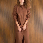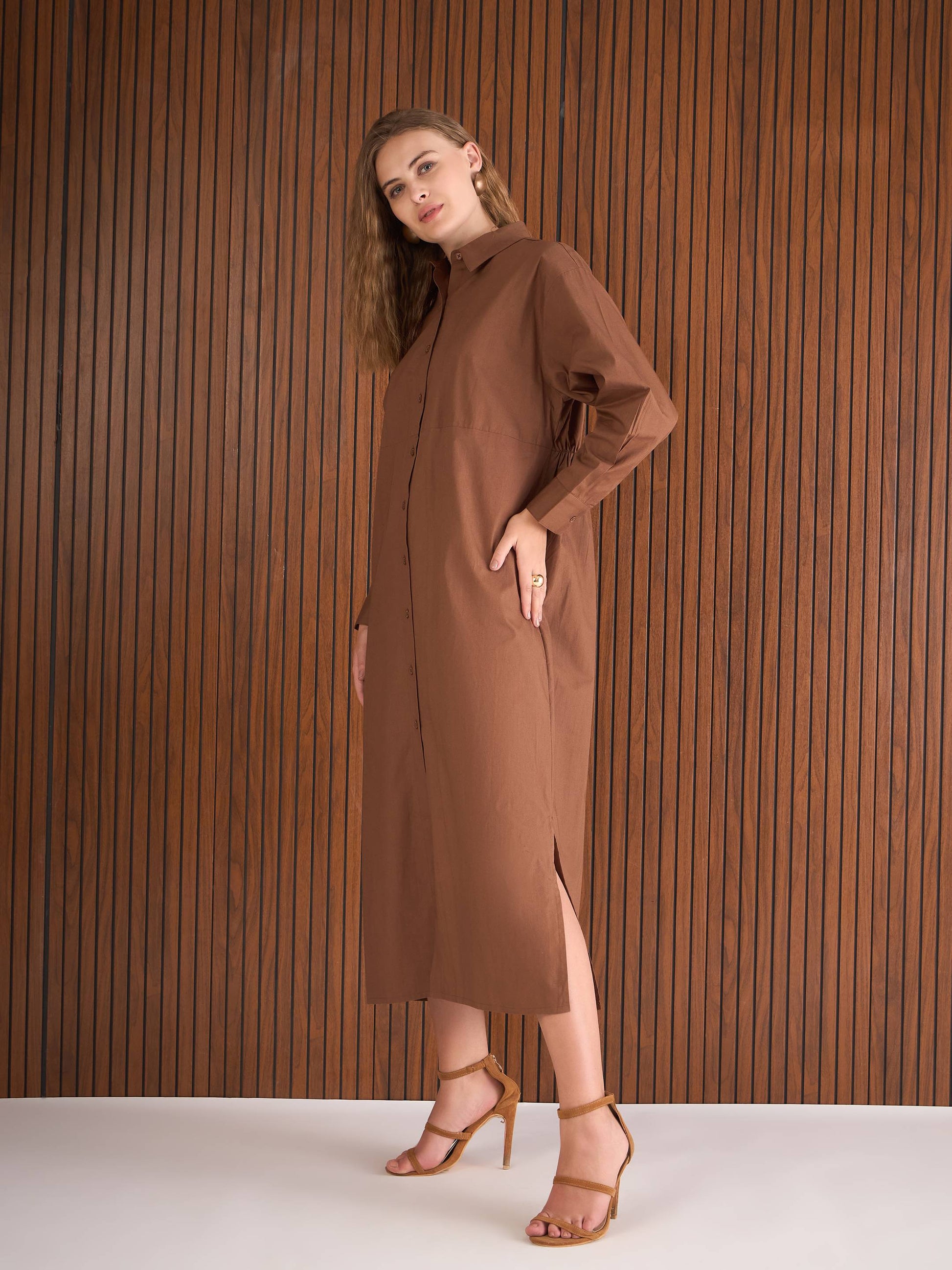 Brown Poplin Longline Shirt Dress, in Poplin fabric, Unlined, Maxi Length, Comfort Fit, Button Closure, Straight Hemline and features Elastic At Back Waist