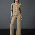 Brown Puff Sleeves Top With Bell Bottom Pants, in Canton Knit fabric, Unlined, Regular Length, Regular Fit , Button Closure, Straight Hemline and features Fancy Button Detail/ Elastic Detail At Back Waist