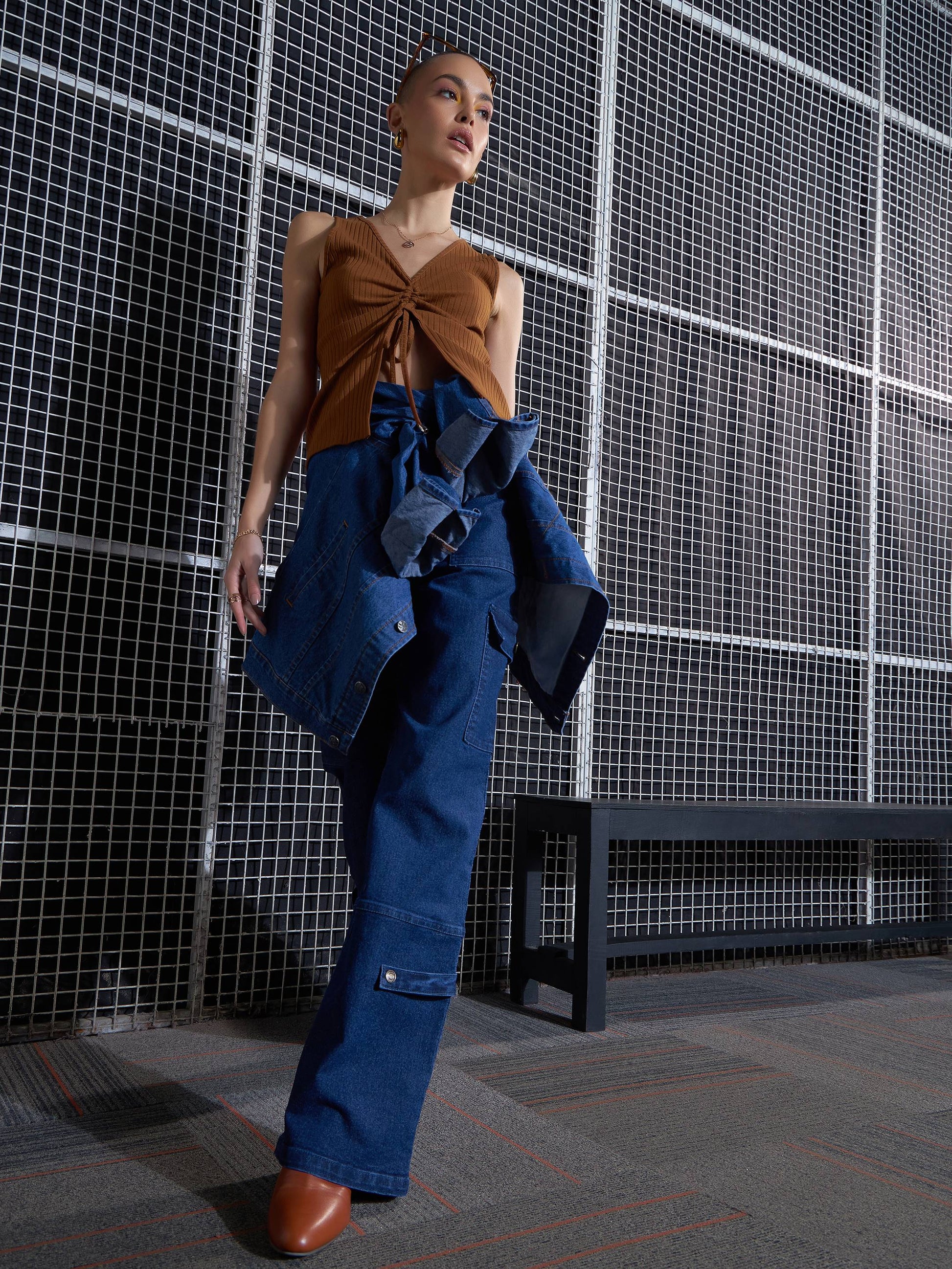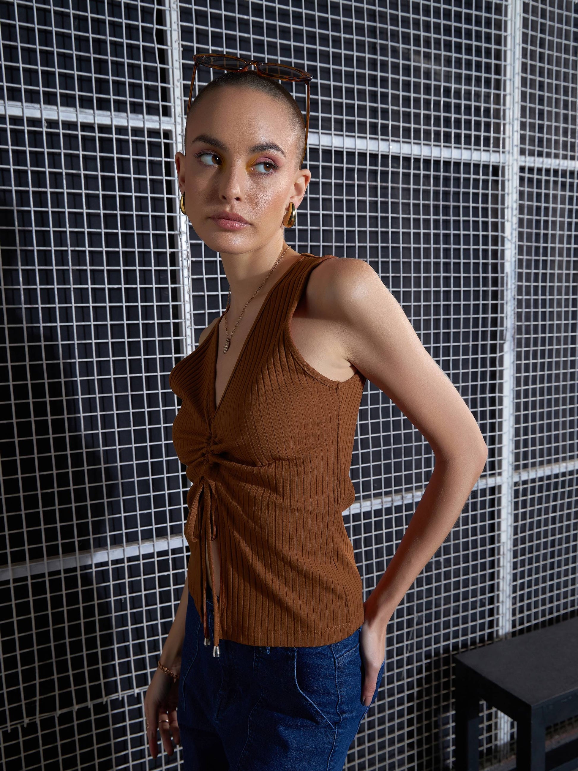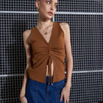 Brown Rib Front Ruched Top, in Rib fabric, Casual , Regular Length, No Closure, Unlined , Drawstring Detail At Front Hemline and features NA