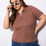 Brown Rib Front Zipper Polo Neck Top, in Rib fabric, Unlined, Regular Length , Comfort Fit , Zipper Closure , Straight Hemline and features Zipper Detail At Front