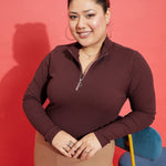 Brown Rib Front Zipper Top, in Rib fabric, Unlined, Regular Length, Comfort Fit, Zipper Closure, Straight Hemline and features Metal Zipper Detail At Front