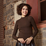Brown Rib Full Sleeves High Neck Sweater, in Viscose Nylon Rib fabric, Unlined, Regular Length, Slim Fit, No Closure, Straight Hemline and features Self Ribbed Design