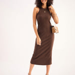 Women Brown Rib Sleeveless Bodycon Midi Dress