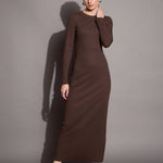 Brown Ribbed Bodycon Maxi Dress, in Rib fabric, Unlined, Maxi Length, Slim Fit, No Closure, Straight Hemline and features Back Slit