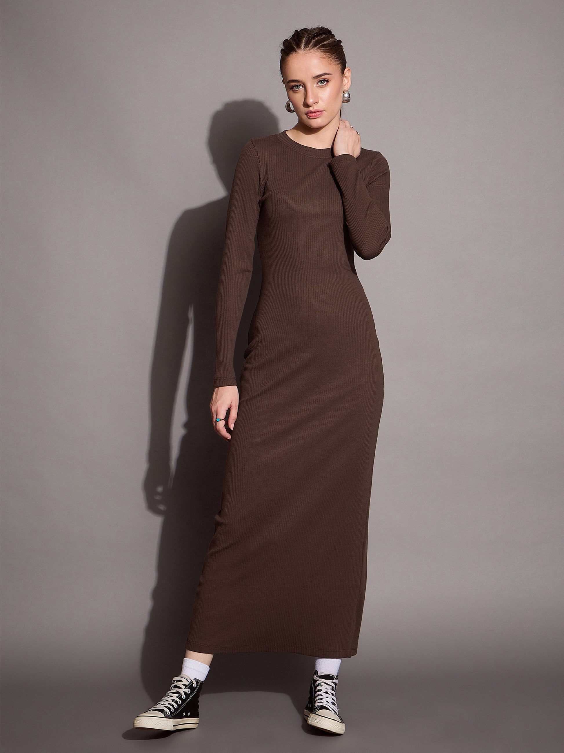 Women Brown Ribbed Bodycon Maxi Dress
