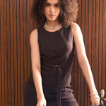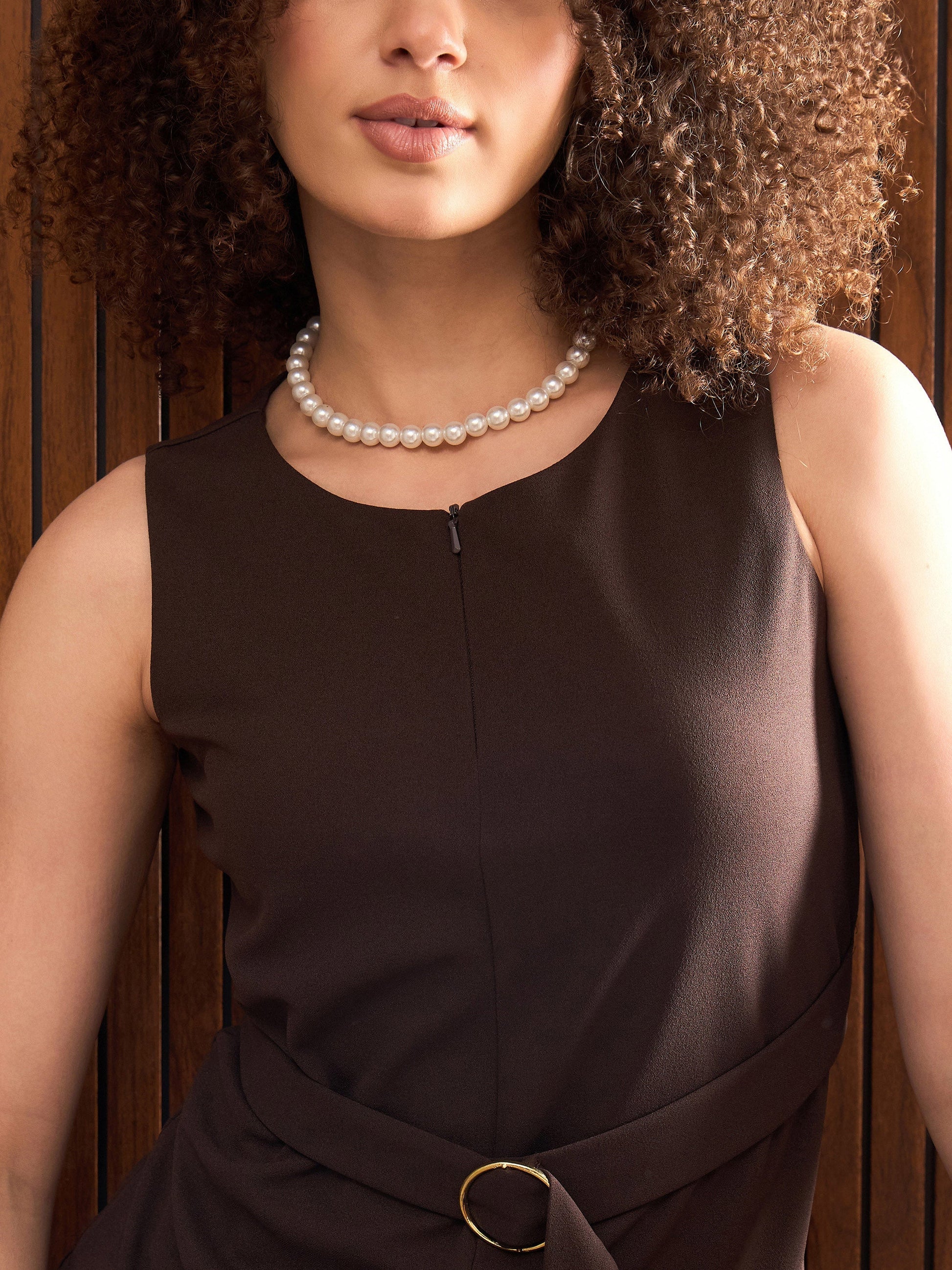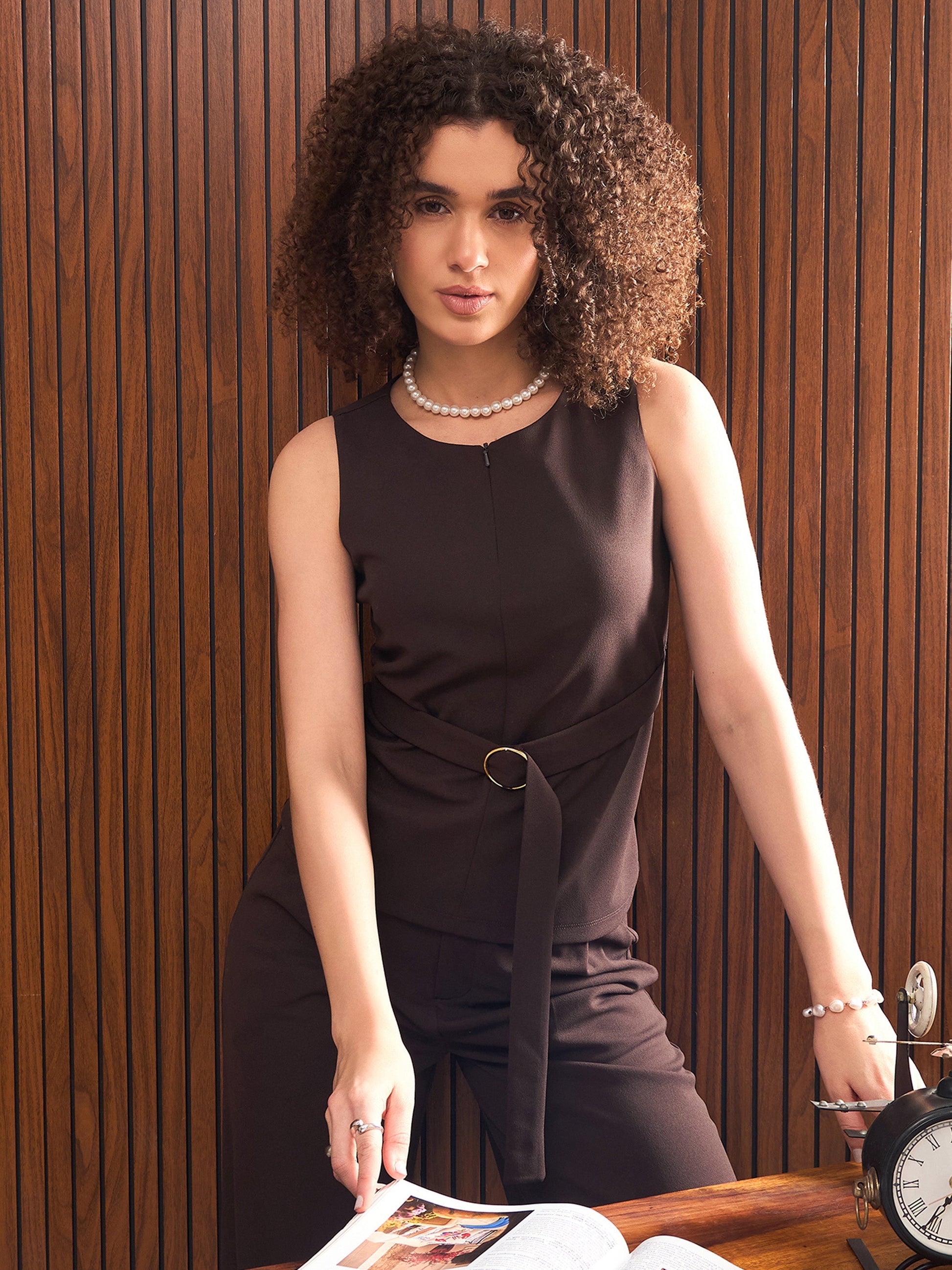 Brown Sleeveless Front Zipper Belted Top, in Canton Knit fabric, Unlined, Regular Length, Regular Fit , Zipper Closure, Straight Hemline and features