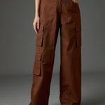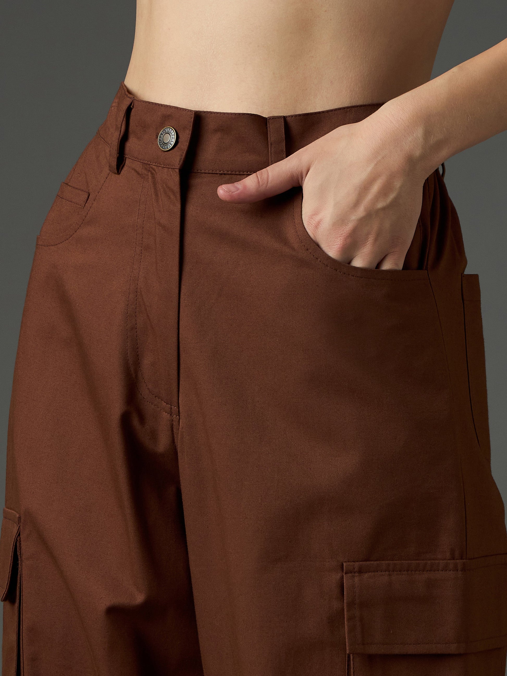 Women Brown Twill Box Pocket Straight Cargo Pants
