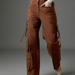 Women Brown Twill Zipper Pocket Cargo Straight Pants