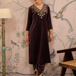 Women Brown Velvet V-Neck Front Embroidered Kurta