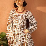 Women Brown & White Quirky Print Back Tie Knot Short Dress