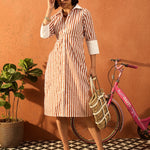 Women Brown & White Stripe Contrast Collar Midi Dress