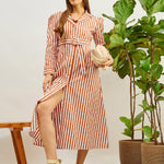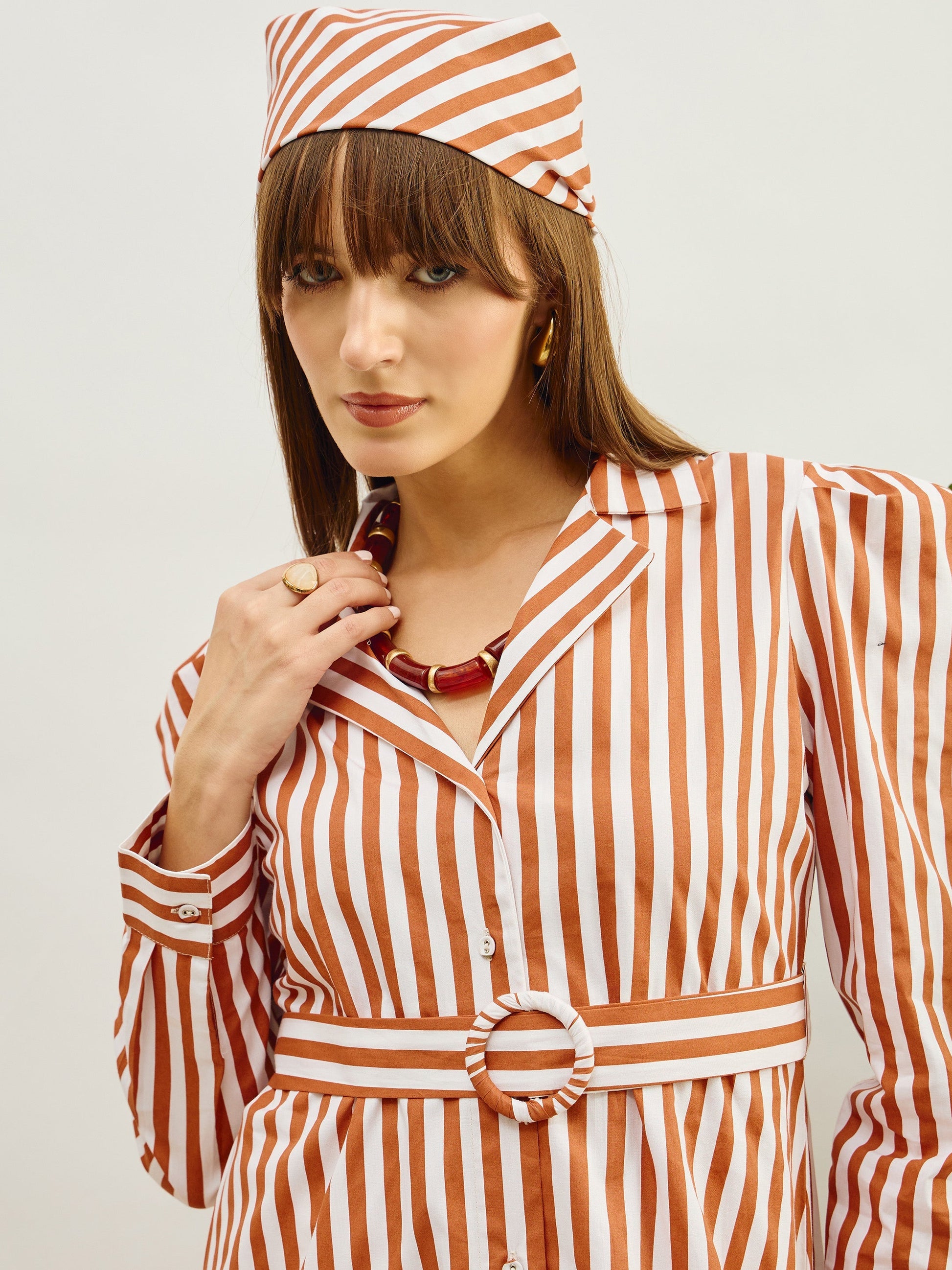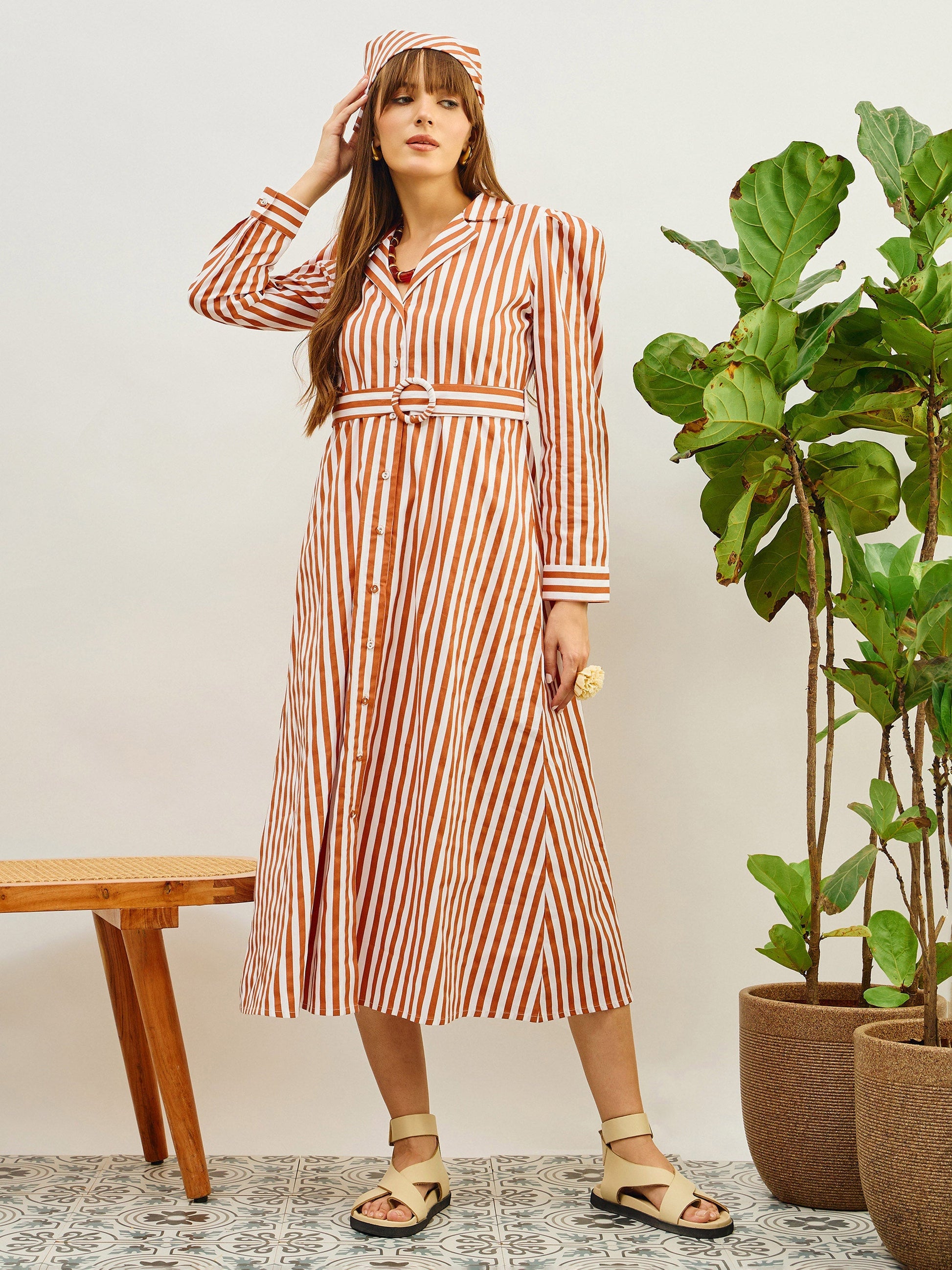 Women Brown & White Striped Poplin Belted Shirt Dress